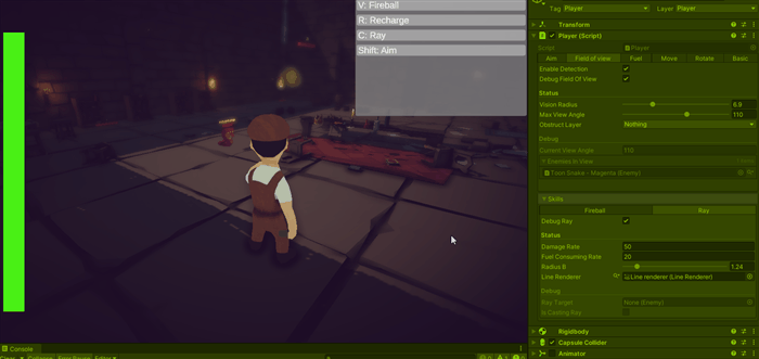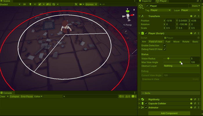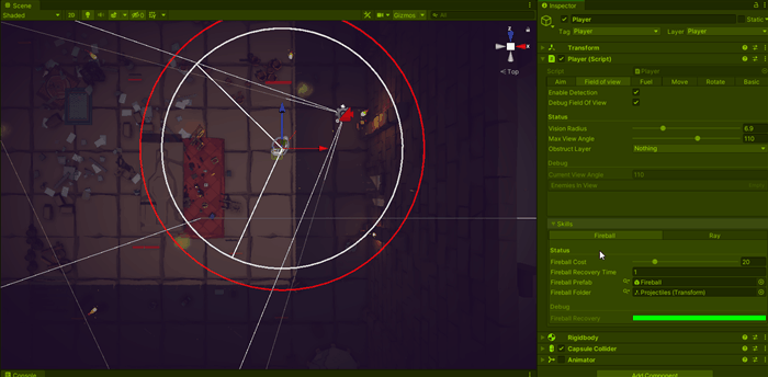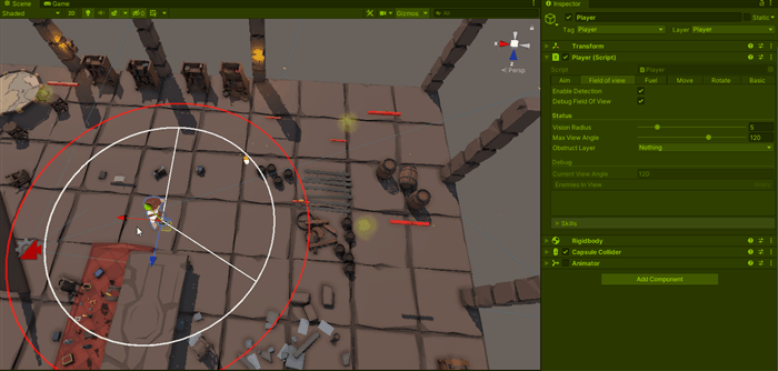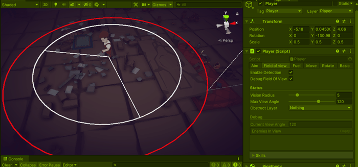 Unity does not have a cone shape detection, so we manually detect objects inside the circle and remove the ones that aren’t inside the cone, we can check/debug current enemies looking at enemies in view in debug section (this will be used to skills to select a target, see skills section)