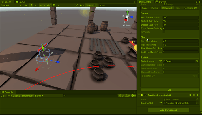 Initially, the plans was to have multiples behaviors on each enemy, therefore I created a state machine to implement their behaviors, these states can be triggered through some buttons on the inspector, but we canceled the project before going further and Idle, Wander, Flee and Die